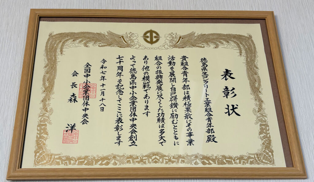 2025年11月18日 徳島グランヴィリオホテルで開催されました徳島県中小企業団体中央会の創立70周年記念式典にて、徳島県生コンクリート工業組合 青年部が、「全国中小企業団体中央会会長表彰 優良組合青年部」で表彰されました。
